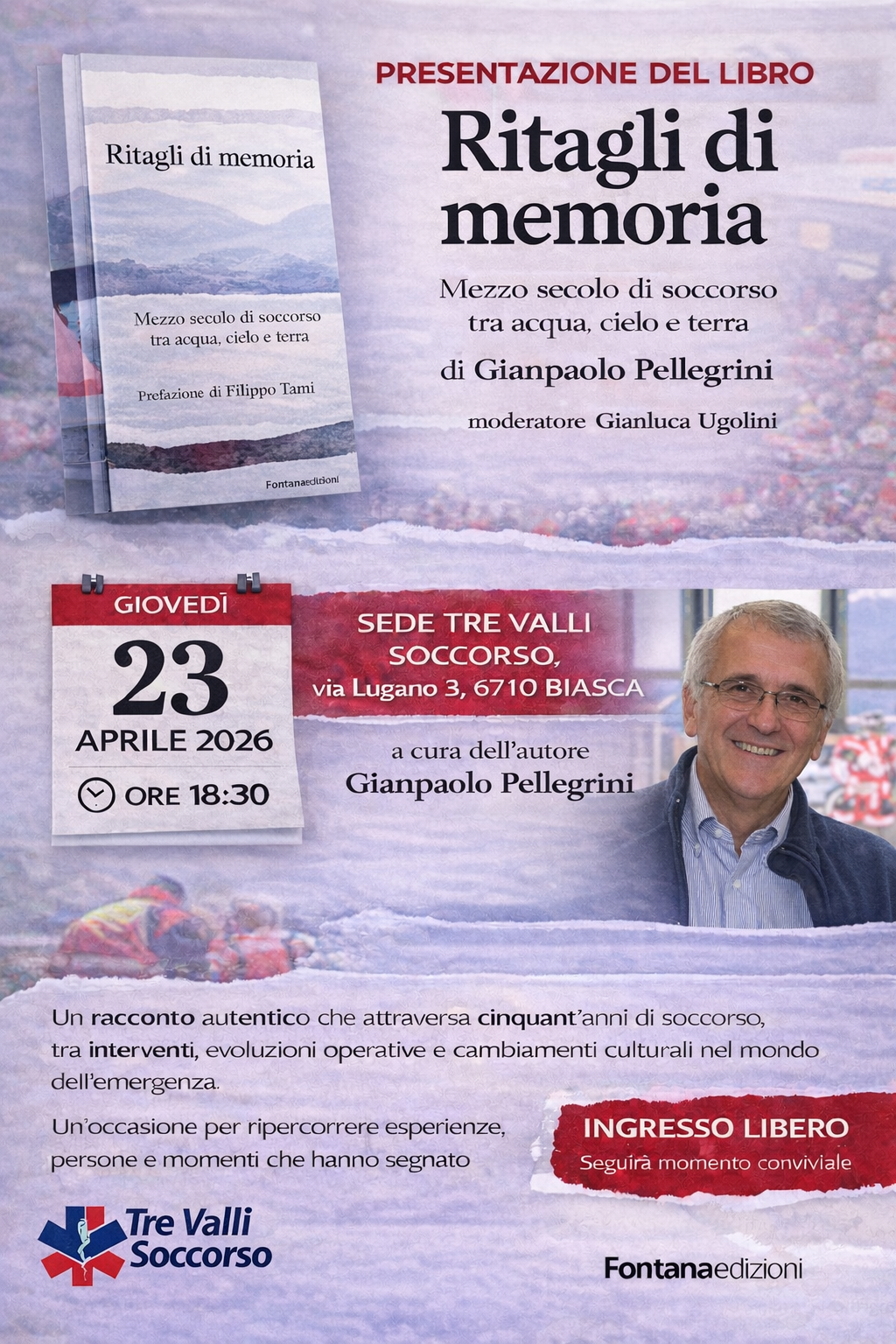 La serata avrà luogo il prossimo 23 aprile 2026 ore 18:30 presso la sala multiuso della sede di Tre Valli Soccorso, Via lugano 3, 6710 Biasca.